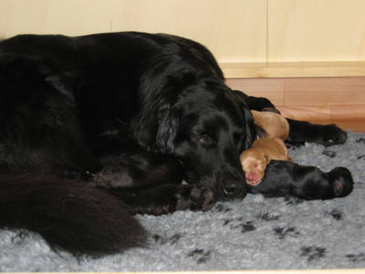 | 2005 wurde Eischa dann zum ersten mal Mutter von 6 Welpen. 2006 folgte der B-Wurf und 2008 der C-Wurf. Eischa schenkte insgesamt 15 Welpen das Leben. Es waren 8 Rüden und 7 Hündinnen. Die Würfe waren von der Farbverteilung her bunt gemischt, trotz oder gerade weil es immer schwarzmarkene Väter waren. Es sind 5 schwarzmarkene, 6 blonde und 3 schwarze Welpen. |