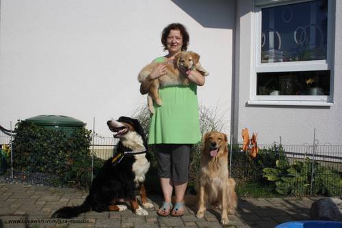 Diego wurde als 5. Welpe um 21.45 Uhr geboren. Schon zu Beginn war er seinen Geschwistern vom Gewicht her überlegen. Er war eher einer der ruhigeren, der sich aber schon von Klein an mit erwachsenen Hunden gut verstand. In der Zwischenzeit ist er fast 70 cm groß und hat sehr viel Temperament. Diego wohnt bei Bettina und dem Bernermix James Bilder von Diego Zum vergrößern "Klick" in das Bild!