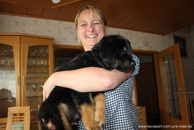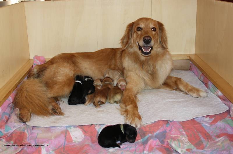 Geburt 02.04.2014, Geburt Pünktlich am 63. Tag ging es los. Nach dem Caija die Nacht bei uns auf dem Sofa verbracht hat, war es um 5.00 Uhr mit der Nachtruhe vorbei. Sie wurde unruhig, wollte nach draußen, die Eröffnungsphase hatte begonnen. Um 5.45 waren dann die ersten richtigen Wehen zu sehen und punkt 6.00 Uhr wurde der erste blonde Rüde geboren. Es folgte ein sm Rüde um 6.25 Uhr und danach noch 2 blonde Hündinnen um 6.56 und 7.18 Uhr. Dann war Pause bis 11.45. Diesmal ein sm Rüde. Um 14.05 wurde noch eine blonde Hündin und um 14.25 Uhr ein sm Rüde geboren. Alle sind munter und Caija geht ihren Mutterpflichten wie immer souverän nach. Deckakt und Trächtigkeit Vater des F-Wurf's Bond vom Gut Grone Bond vom Gut Grone, ein kräftiger sm Rüde. Mit seinen 6 Jahren ebenfalls im besten Alter. Sein Wesen und seine Ausstrahlung hat uns von Anfang an begeistert. Bond ist Vater von 3 Würfen, der 4. wird in der nächsten Woche erwartet. Wir erwarten kräftige und arbeitsfreudige Welpen, vielleicht sogar in allen 3 Farbschlägen. Wer mehr über Bond erfahren möchte, findet es auf seiner Homepage unter: bond-vom-gut-grone Mutter des F-Wurfs Caija vom Jura-Meer Es soll der dritte Wurf von unserer Caija vom Jura-Meer werden. Sie ist ein lebhafte blonde Hündin. Mit ihren 6 Jahren eine sichere Hündin, auf die man sich verlassen kann. Als ausgebildeter Rettungshund sind wir mit ihr immer wieder bei Einsätzen auf der Suche nach vermissten Menschen. Zurück zur Übersicht