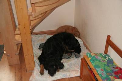 hier schicken wir euch endlich die ersten Bilder von Enya in ihrem neuen Zuhause! Sie hat sich sehr schön eingelebt, schläft die Nächte durch und hat bisher (toi, toi, toi!) noch nicht einmal reingemacht. Auch mit DÃsa versteht sie sich sehr gut; die Kleine darf sogar mit in DÃsas Heia liegen, sofern sie sich nicht allzu viel bewegt...