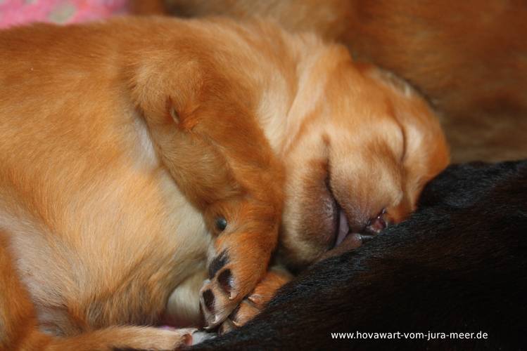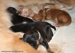 Die ersten 8 Lebenswochen 01.02.2013 oder 2. Lebenstag Fressen, schlafen, fressen, schlafen, ab und zu mal quieken oder sogar schon empörtes bellen. So verläuft der Tag zur Zeit bei unseren Welpen. Caija ist völlig entspannt. Sie schläft viel, frisst Unmengen und kümmert sich liebevoll um ihre Welpen. Die Welpen nehmen schön zu, nur zu verständlich bei 10 Zitzen voller Milch. Oma Eischa schaut auch immer mal wieder vorbei um beim säubern der Welpen zu helfen. 02.02.2013 oder 3. Lebenstag Den Kleinen geht es blendend. Die Nabel sind abgefallen. Alle sind jetzt gut im plus bei der Gewichtszunahme. Caija verlässt jetzt auch mal die Wurfkiste, wenn auch nur ganz kurz.