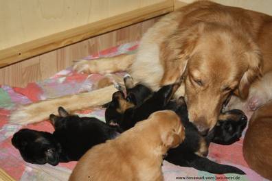 23.02.2013 oder 24. Lebenstag Die Wachphasen unserer Welpen werden immer länger. Ist die Wurfkiste offen, wird unsere Wohnung erobert um dann nach 10 bis 15 Minuten wieder tief und fest zu schlafen. Deshalb heute ein paar Bilder, nach einem solchen Abenteuer. 25.02.2013 oder 26. Lebenstag Vergangenes Wochenende hatten die Welpen endlich neue Opfer, deren Zehen sie bearbeiten konnten. Der erste Welpenbesuch war da und die Kleinen zeigten sich von ihrer besten Seite. Vor allem Elea: sie ist halt doch ein echtes, kleines "Teufelchen", gell Claudia 27.02.2013 oder 28. Lebenstag Heute haben wir Halbzeit. Die Welpen wuseln um unsere Füße. Sobald wir auf dem Boden knien, sind wir belagert. Bilder machen ist eher schwierig, meist hängt einer in den Haaren, einer an dem Gurt der Kamera und einer beißt in die Zehen. Sind sie dann müde, fallen sie in die Wurfkiste. Eastewood heult ihnen dann noch ein Schlaflied vor und sofort ist Ruhe. 01.03.2013 oder 30. Lebenstag Spielen, schlafen und an Mamas Milchbar trinken. So sieht der Rhythmus unserer Welpen aus. Nach dem Spiel wird an Ort und Stelle eingeschlafen und nur die ganz tapferen schaffen es noch bis in Wurfkiste. 04.03.2013 oder 33. Lebenstag Am Wochenende gabe es die erste Welpenmilch für unsere Kleinen. Alle schlapperten mit großem Genuss aus dem Napf und alles lief sehr gesittet ab. Dann war am Samstag und Sonntag endlich mal die Sonne zu sehen und der letzte Schnee war getaut: jetzt konnten die Welpies auch mal in den Garten. Sie fanden es klasse! Für 2 unserer Rüden suchen wir noch liebe Menschen, die sie gerne bei sich aufnehmen möchten. 06.03.2013 oder 35. Lebenstag Heute sind die Welpen 5 Wochen alt. Das Wetter lässt es zu, dass sie viel im Garten spielen und toben können. Elea wird in Zukunft Emmy gerufen, deshalb haben wir den Namen zusätzlich in ihre Ahnentafel eintragen lassen. 07.03.2013 oder 36. Lebenstag Heute gab es zum ersten Mal Fleisch als Futter für die Welpen aus der Hand und es blieb nicht nur beim Fleisch, es war auch ab und zu ein Stück der Hand dabei. Und dann war da noch ein großer Hund zu Besuch. Mehr unter "Aktuelles". Das Bild zeigt unsere "kleine" Hundebox. Und hier die Quizfrage: wieviele Hundewelpen liegen gerade in der Box?? Auflösung demnächst auf dieser Seite. 10.03.2013 oder 39. Lebenstag Endlich lässt es das Wetter zu, dass die Welpen viel Zeit im Garten verbringen. Das Bällebad wurde gleich erkundet und der Dosensack lässt sich super durch den Garten ziehen. 13.03.2013 oder 42. Lebenstag So, die Kälte ist wieder da. Die Welpen sind jetzt wieder vermehrt im Haus. Caija legt sich immer wieder dazu um mit ihnen zu spielen, sie zu putzen und natürlich um sie zu erziehen. 15.03.2013 oder 44. Lebenstag Nach der Kälte kam jetzt auch wieder der Schnee. Unsere Welpen sind also Wettertechnisch mit allen Umständen bekannt, von Sonne, Regen über Schnee und Gewitter. Ansonsten entwickeln sich alle prächtig. Sie haben einen ausgeprägenten Beutetrieb. Bevorzugt werden hier vor allem Hosenbeine. Ja und eine Hüpfmaus ist auch wieder dabei. Aus dem Sitz heraus hochspringen beherrscht sie phantastisch. 16.03.2013 oder 45. Lebenstag Trotz der Kälte sind die Kleinen am liebsten draußen. Gut geschützt legen sie sich am liebsten alle zusammen in die Box. 18.03.2013 oder 47. Lebenstag Am Wochenende war wieder mal viel los bei denen vom Jura-Meer. Am Samstag kamen doch Cosmo und Cinja mit ihren Familien auf einen Besuch bei den E-lies vorbei. Außerdem konnte es Papa Alvaro auf dem Rückweg von Stuttgart nicht lassen, seine Kinder persönlich zu besuchen! Er fand sie doch sehr anstrengend, aber Caija hat sich riesig gefreut ihn wieder zu sehen (natürlich auch Oma Eischa: "so ein hübscher, kraftvoller Rüde...."). Am Sonntag war dann unser Esszimmer kurzzeitig wegen Überfüllung geschlossen: Gundi war nebst Anhang und Nando (Kiran von der Haselhöhe) vorbeigekommen. Außerdem kam dann auch noch Faro (Amato vom Jura-Meer) mit Anhang und zum Schluss noch Susi mit Bono. Liebe Fam. Hornig, wir hoffen, es wurde ihnen nicht zu viel 21.03.2013 oder 49. Lebenstag Rasant vergeht die Zeit mit unseren Welpen. Jetzt sind sie bereits 7 Wochen alt. In den kommenden Tagen werden wir den Tierarzt besuchen und noch mehrmals mit dem Auto fahren. Immer wieder gibt es neues Spielzeug sowohl im Garten als auch im Haus. Auf den Seiten der Welpen gibt es jetzt wieder neue Einzelbilder. 25.03.2013 oder 53. Lebenstag Heute zeigen unsere Welpen, wie entspannend es ist, gewogen zu werden. Zuerst die Jungs... ...und jetzt die Mädels... 26.03.2013 oder 55. Lebenstag Beim Blick aus dem Fenster trauten wir kaum unseren Augen: alles weiß! In der Nacht von Sonntag auf Montag kam der Schnee wieder zurück. Da bleibt nur eins: Alle ins Haus und hier wird dann gespielt und geschmust. Es gibt wieder neue Filme auf Youtube. 28.03.2013 oder 57. Lebenstag Jetzt ist es soweit. Die Welpen wurden letzte Woche geimpft und gechippt, das Blut für die Datenbank wurde genommen. Gestern war nun die Wurfabnahme und heute ziehen 2 der 6 Welpen schon aus. Überprüft vom Zuchtwart und den Anwärtern, zeigten die Welpies keinerlei Scheu. Das Urteil: ein sehr gleichmäßiger Wurf und eine vorzügliche Zuchtstätte. So schließen wird jetzt das Tagebuch des E-Wurfs hier im "Jura-Meer". Wir freuen uns aber über viele Bilder und Berichte aus dem neuen zu Hause der Welpen. Zu finden dann unter "Welpenpost" Zurück zur Übersicht