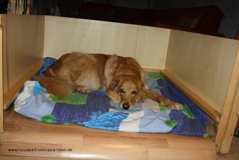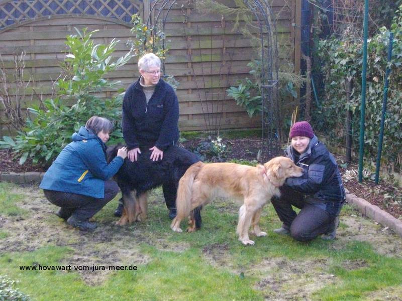 18.03.2014 oder 49. Tag der Trächtigkeit Nur noch 2 Wochen, dann ist es soweit... Caija wird zusehends kugelrund. Wir können nur noch Staunen, wie sehr ihr Bäuchlein wächst. Gerne legt sie sich auf den Rücken und genießt es, wenn wir sie kraulen und streicheln. Patrick hat dabei auch die ersten Welpenbewegungen gespürt. In der Zwischenzeit bekommt sie 3 x am Tag etwas zu fressen, denn ihr Appetit ist ungebrochen. 08.03.2014 oder 38. Tag der Trächtigkeitstag Über die Hälfte der Trächtigkeit liegt hinter Caija. Der Bauch rundet sich zusehends, wir haben wieder begonnen den Umfang zu messen. Ansonsten ist sie wie immer sehr verschmust und absolut verfressen. Warum sie nicht mit zu der Rettungshundestaffel und in die Hundeschule nach Durlangen mit darf, versteht sie nicht so wirklich. Aber besser ist es. Dafür satteln wir dann das Fahrrad und drehen eine Runde ganz allein mit ihr (ohne die etwas langsamere Eischa 24.02.2014 oder 26. Tag der Trächtigkeit Heute war Termin zum Ultraschall. Caija war schon ganz aufgeregt und ist beim Tierarzt sofort auf den Tisch gesprungen, obwohl der Tierarzt nicht gleich Zeit für uns hatte. Aber dann war es soweit. Man muss dazu sagen, dass unser Dr. Grün hier nicht viel aufhebens macht: Bauch einsprühen und rann mit dem Schallkopf. Und dann haben wir sie gesehen, kleine Fruchtblasen. Caijas Gehemins ist somit gelüftet: im April gibt es kleine Hovi-Scherze. 20.02.2014 oder 22. Tag der Trächtigkeit Vielen Dank für die lieben Glückwünsche zum Deckakt und fürs Daumen drücken. Caija geht es richtig gut, sie ist verschmust und verfressen, manchmal scheint sie auch schon in sich gekehrt. Eine Prognose ob sie trächtig ist oder nicht, wagt hier keiner zu machen. Aber es ist ja nicht mehr lange bis zum Ultraschalltermin. Dann wissen wir hoffentlich, ob Anfang April die Wurfkiste mit vielen kleinen Hovis gefüllt wird. Bis dahin heißt es abwarten und Daumen drücken Deckakt Am 29.01.2014 machten wir uns auf den Weg nach Sandhausen. Dort erwartete uns bereits die Fam. Stolzenberger und natürlich Bond. Er freute sich riesig uns zu sehen. Noch größer war aber die Freude, als er unsere Caija in seinem Garten vorfand. Innerhalb von von kürzester Zeit war die Arbeit getan. Wir Menschen haben dann noch den Schriftverkehr erledigt und uns bei einer Tasse Kaffee aufgewärmt. Vielen Dank an die Fam. Stolzenberger, dass sie sich für uns Zeit genommen haben. Danke auch an die Besitzer des Reserverüden, die im Notfall eingesprungen wären! Zurück zur Übersicht