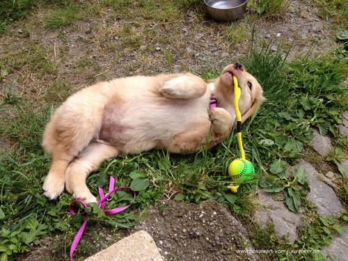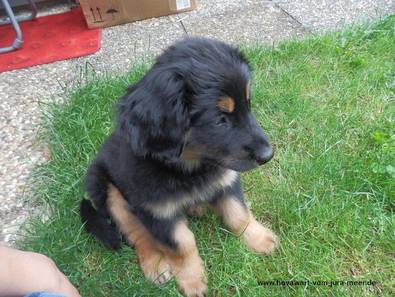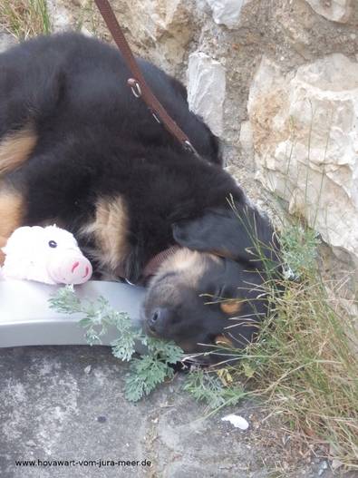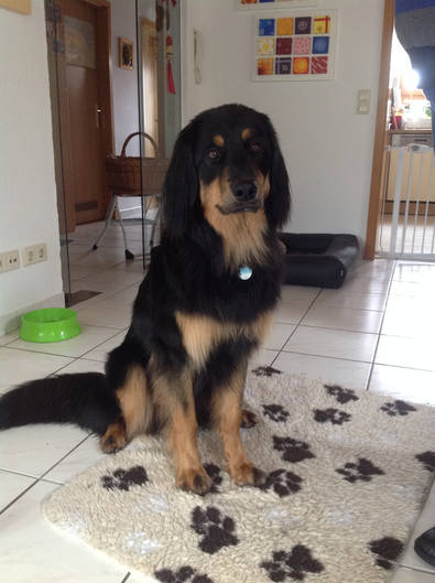 Hallo Mama, Oma, Fajara und Fam. Lang, seit 2 Tagen bin ich nun bei meiner neuen Familie und habe mich schon super eingewöhnt. Auf der Heimfahrt war ich noch etwas ängstlich und habe ganz laut gejault. Im neuen Zuhause angekommen, gab es aber viel zu erkunden und ich habe schnell gemerkt, dass es hier auch sehr schön ist. Vor allem im Garten gefällt es mir sehr gut. Es gibt jede Menge zu tun und vor allem viele Sträucher, Blätter und sonstiges Grünzeug, in das ich reinbeißen kann. Mein Lieblingsplatz ist mitten im Beet und auf den Moossteinen. Ich bin auch gerne behiflich beim Entfernen von Moos. Allerdings findet das meine Familie nicht so toll. Heute Nacht habe ich schon bis 4 Uhr durchgeschlafen. Nach einem kurzen nächtlichen Ausflug in den Garten, schlafe ich dann auch brav in meiner Hundebox weiter. Jeden Tag treffe ich neue Familienmitglieder und es nimmt kein Ende. Aber da alle immer so nett zu mir sind, werfe ich mich dann auch gleich auf den Rücken und lasse mich am Bauch kraulen. Niemand kann sich vorstellen, dass ich auch mal ein richtiger Hovawart (und Wachhund) werde. Sitz mache ich schon ganz super, da gibt es auch immer eine leckere Belohnung. Nach dem Spielen bin ich immer etwas übermütig und ich brauche eine Weile bis ich mich wieder beruhigt habe. Im Haus habe ich viele tolle Schlafplätze. Da mache ich es mir so richtig gemütlich, am Liebsten auf einer Decke oder einem Kissen. Das Fressen hier ist lecker und ich habe großen Appetit. Ich freue mich schon auf ein baldiges Wiedersehen mit euch, denn ich vermisse euch alle natürlich. Viele Grüße von Fönix Die erste Nachricht und erste Bilder von Kaya (Fiora) im neuen Heim Hallo Mama! Hallo Oma! Hallo Kerstin, Dieter und Patrick! Ich bin nun seit 2 Tagen in meinem neuen Zuhause! Die Autofahrt dahin hab ich echt gut überstanden. Pipi und großes Geschäft Mach ich fast immer draußen und die Zweibeiner hier loben mich dann immer ganz toll. In der Wohnung darf ich fast überall hin, nur der Spielteppich von dem kleinen Noah ist tabu für mich und abgesperrt, aber ich hab da auch schon versucht durch zu kommen, wurde aber erwischt und es kam dann ein NEIN. Daher bleib ich nun lieber weg. ich laufe viel hinter Noah her, der aber noch ein klein wenig Angst vor mir hat und dann immer zu seiner Mama geht und dann lass ich ihn in Ruhe, aber es wird von Tag zu Tag besser und er hat mir nun heute morgen sogar schon seinen Ball gegeben. Wenn Tina oder Bodo mich rufen hör ich schon recht gut und auch Sitz klappt ab und an recht super, und das tolle ist wenn ich was richtig mache bekomm ich was leckeres! Nachts schlaf ich vor oder neben dem Bett und wenn ich raus muss dann steh ich auf und fiepst und schon kommt einer der beiden und ab gehts nach draußen. Klappt aber nicht immer ;) ansonsten tu ich am Anfang wenn es abends ins Bett geht immer erst mal etwas jaulen, aber auch das werde ich abstellen. Ich hoffe es bleibt hier so toll und ich sehe meine Geschwister, Mama und Oma bald mal wieder,
