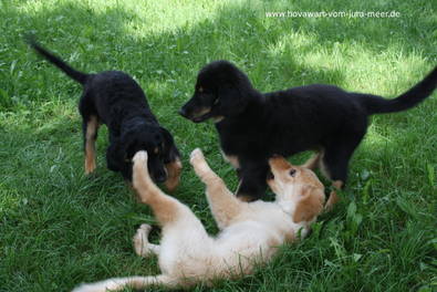nach einer Woche wollte ich mal melden und kann nur Gutes berichten: Eurer Welpe hat sich super eingelebt und unser Großer geht vorbildlich mit ihm um. Auch mit den beiden Katzen hat er sich angefreundet. Ende nächster Woche stellen wir ihn dann der TÄ zum Impfen vor. Wir haben viel Freude mit unserem neuen Familienmitglied.