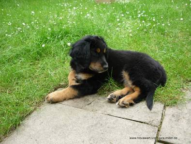 Hallo liebe Familie Lang, unser kleiner Finley ist nun den 3. Tag bei uns und wir wollen euch gern ein paar Fotos zukommen lassen. Er ist wirklich ein super lieber und braver Welpe. In der ersten Nacht hat er uns nur zweimal geweckt und letzte Nacht hat er sogar bis um 5 Uhr morgens durchgeschlafen. Sein Lieblingsplatz ist - typisch Hovi - auf einer Ikeafolie im Flur unserer Wohnung. Das Pipimachen im Freien klappt auch schon hervorragend.