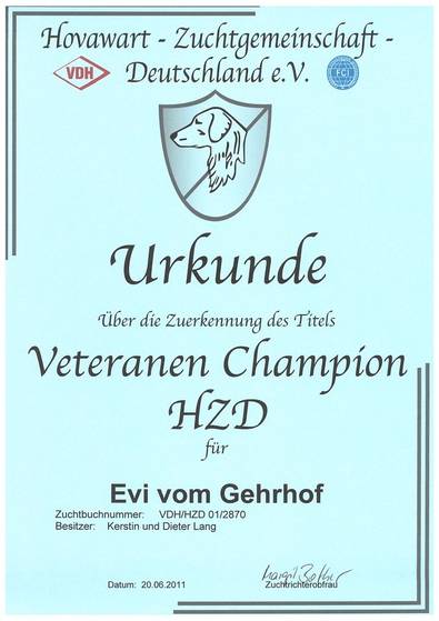 | 2014 feiert Eischa ihren 13. Geburtstag. Auch den Titel HZD-Veteranen-Champion hat sie zuerkannt bekommen. Eischa ist mit ihren 13 Jahren immer noch fit und wir hoffen, das dies noch lange so bleibt!
